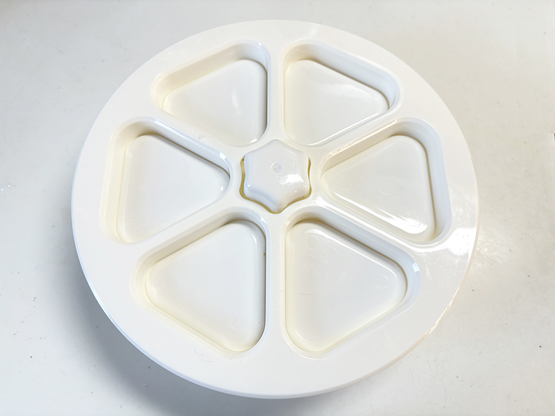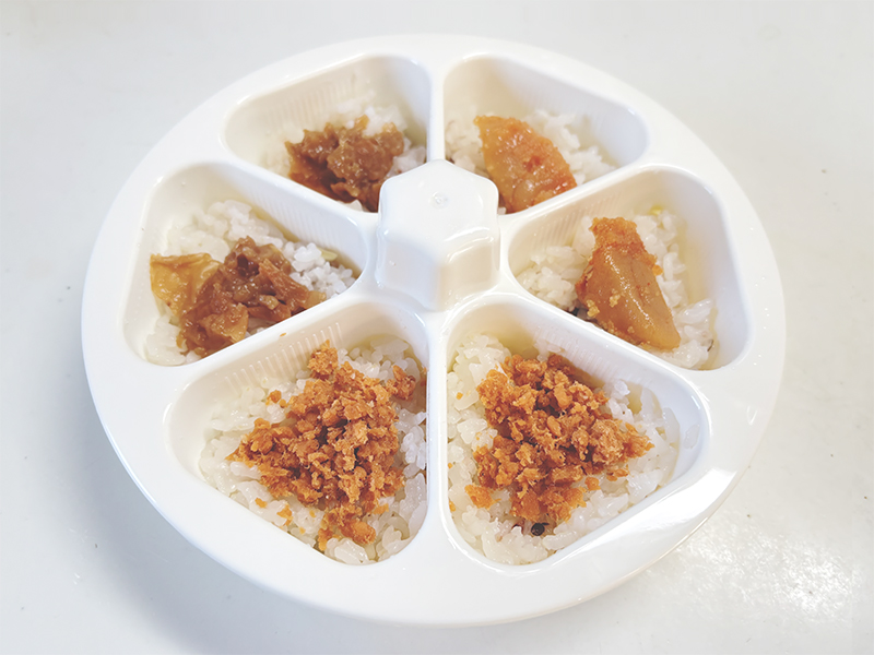 具材の上に残りのごはんを乗せてふたをします。上から力を均一に押し込んだら、蓋が落ちないように押さえながら逆さにして揺すり、本体部分を持ち上げると6個のおにぎりが完成。